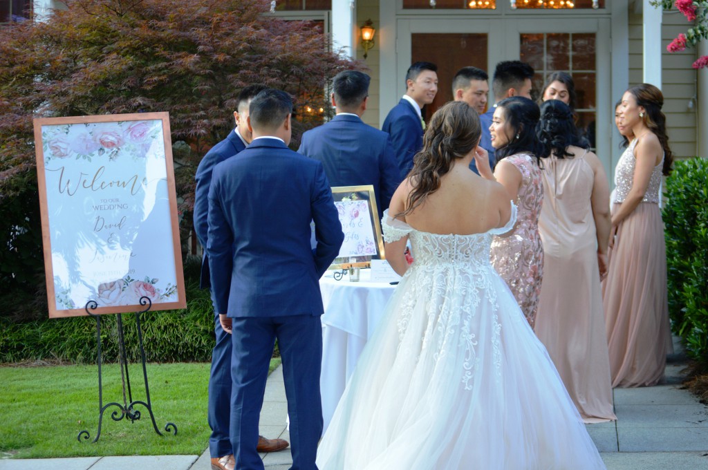 I cannot say enough good about Jasmine and David’s Wedding reception here at the 173 Carlyle House in historic Norcross!!! They first got married at St. Monica’s Catholic Church. After that, they came to the Carlyle House where they greeted all their guests out on the terrace under the arbor as they arrived! It was a perfect set up, they had the guest book and photo booth outside too. It was the best opportunity to visit (quickly) with each guest individually, give them a big hug and thank them for coming.